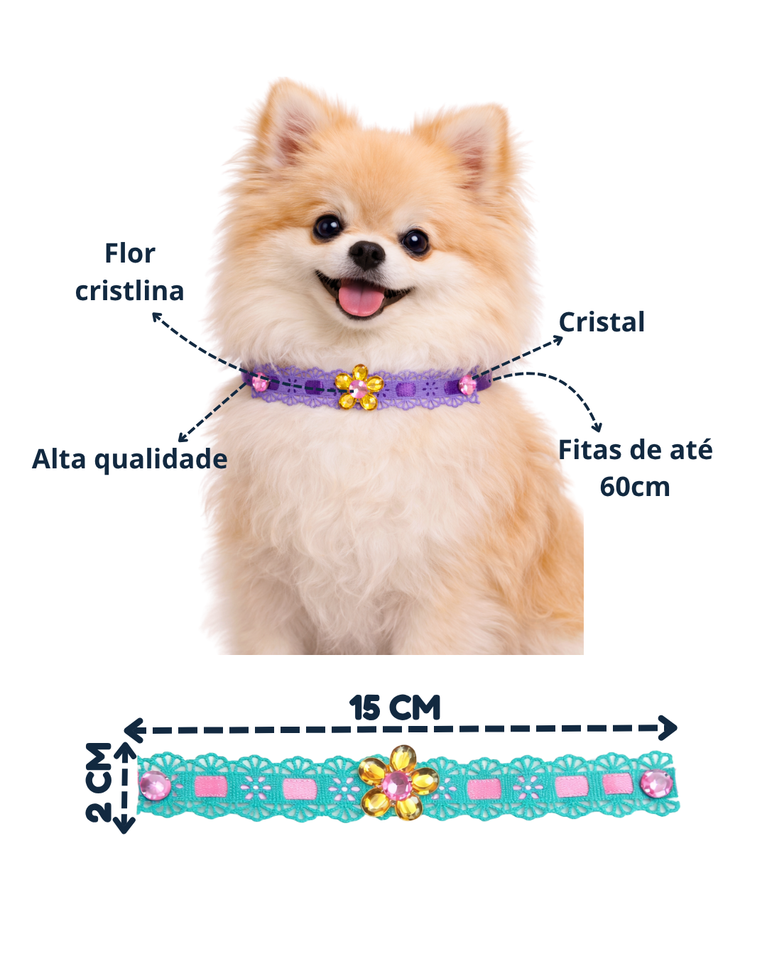Produzido com material de alta qualidade, esse acessório combina delicadeza, conforto e um acabamento sofisticado. A aplicação de flor com pedras brilhantes traz um visual encantador e diferenciado, perfeito para destacar seu pet.