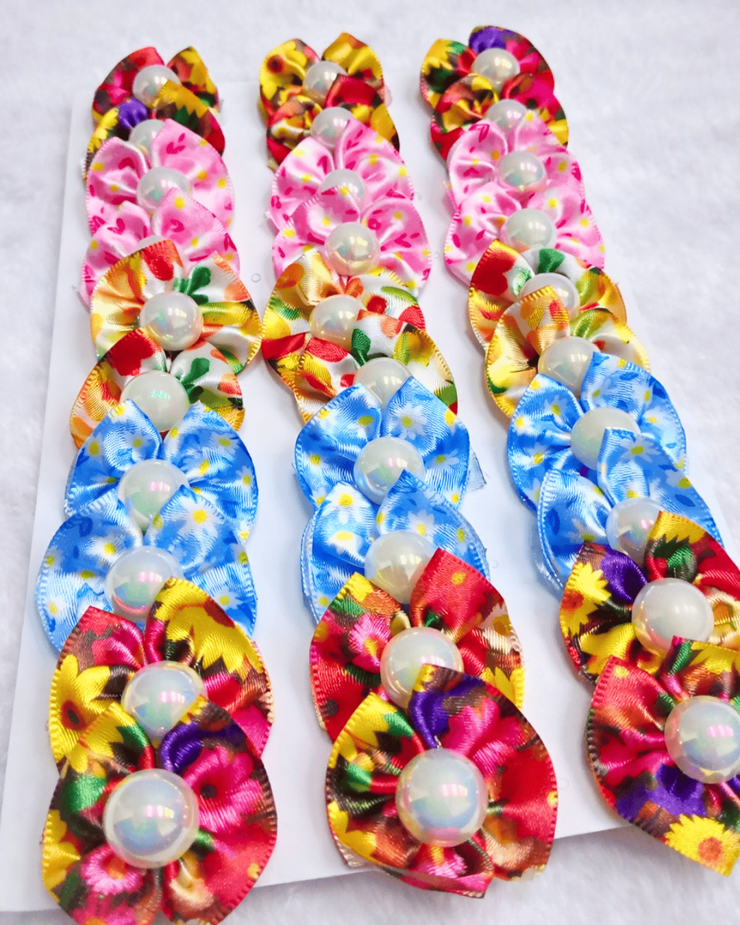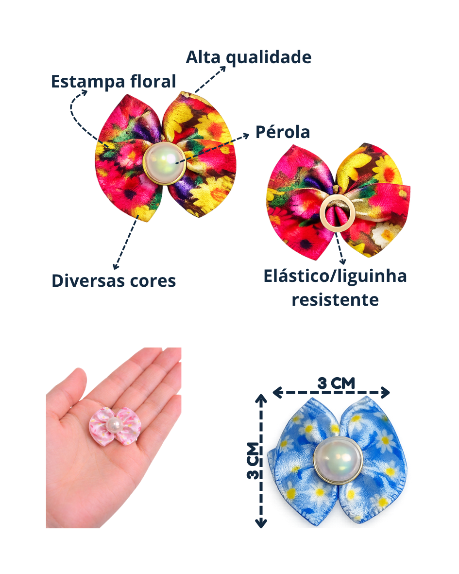 Produzidos em material de alta qualidade, esses laços combinam delicadeza, estilo e conforto. A estampa floral traz um visual moderno e encantador, enquanto a aplicação de pérola adiciona um toque sofisticado que valoriza ainda mais o acessório.